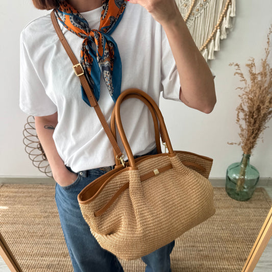 Bolso saco estructurado rafia y piel camel