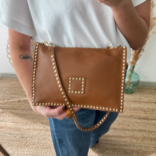 Bandolera camel piel tachuelas doradas