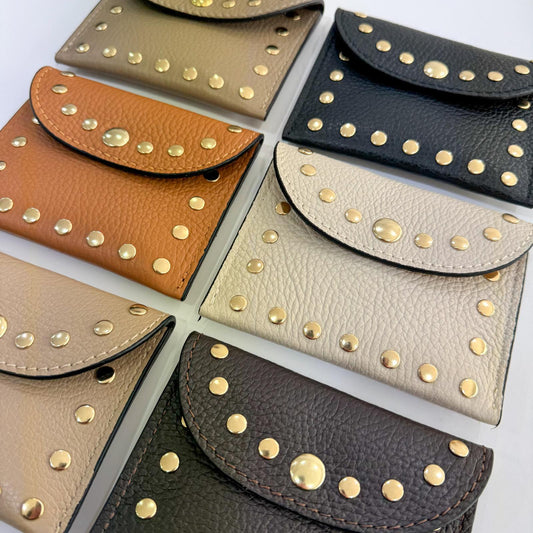 Bandolera ovalada piel tachuelas camel iniciales bordadas