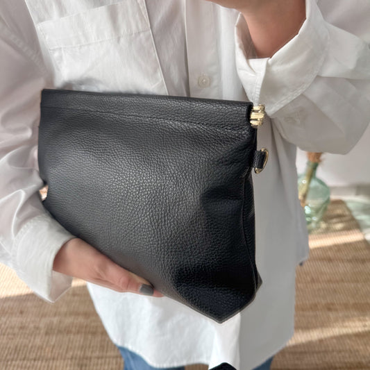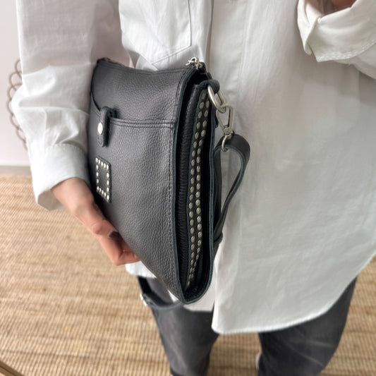 Bandolera ovalada piel tachuelas negro iniciales bordadas
