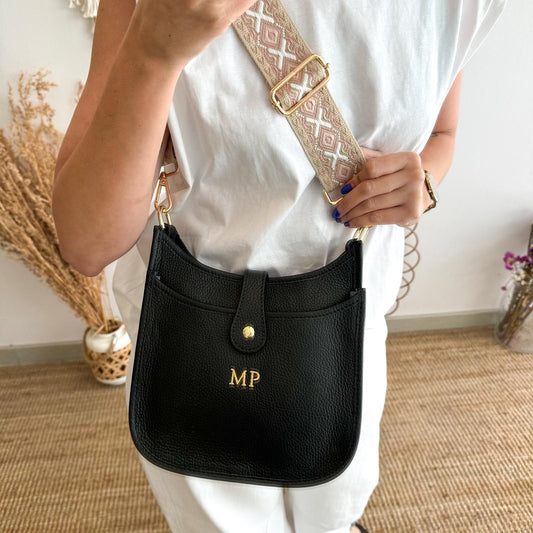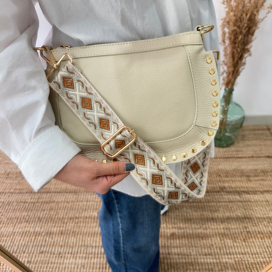 Bandolera loneta beige iniciales bordadas con correa étnica