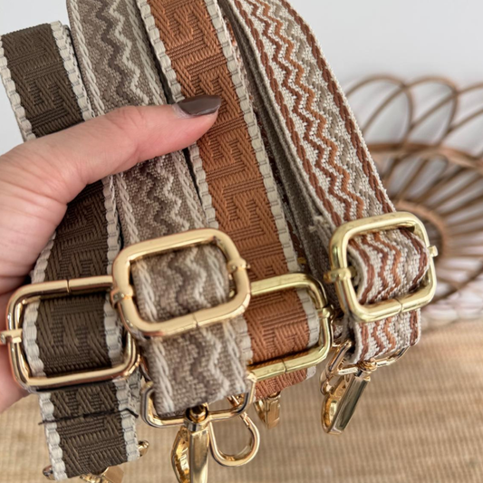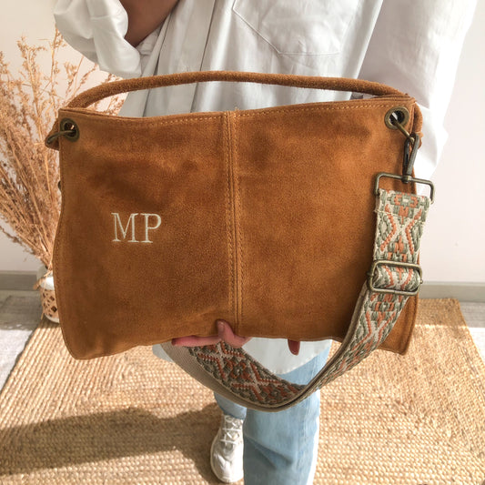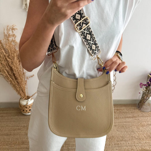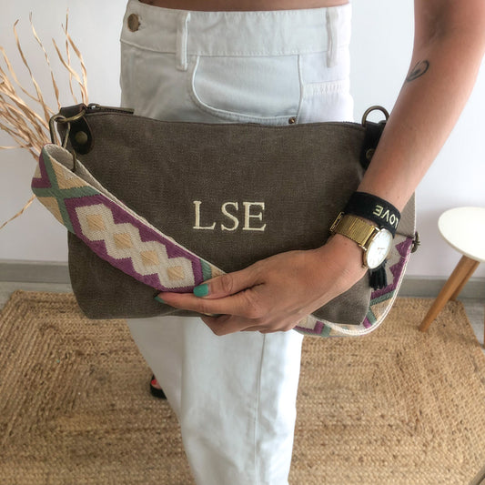Bandolera loneta taupe iniciales bordadas con correa étnica