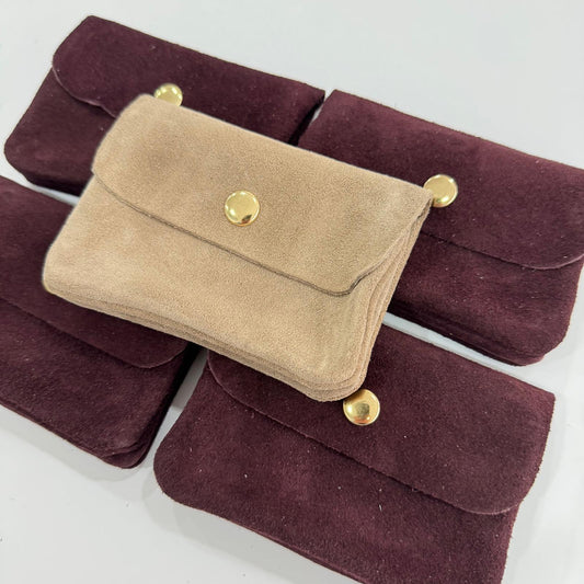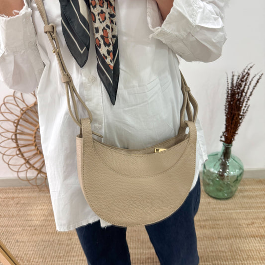 Bandolera ovalada piel tachuelas taupe iniciales bordadas