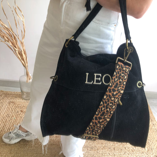 Bandolera serraje taupe cierre boquilla iniciales bordadas