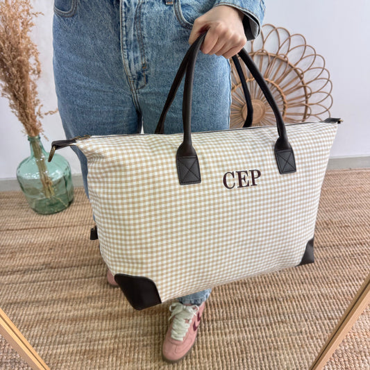 Bolso combinado algodon y piel beige cuadros vichy iniciales bordadasPrecio habitual €76,00Precio habitualPrecio unitario por-