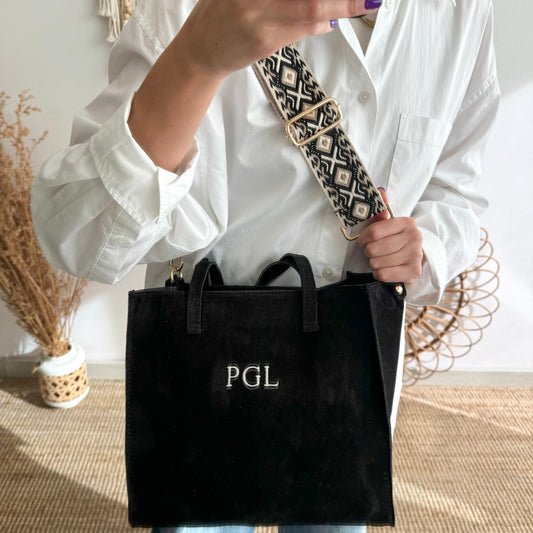 Bolso combinado loneta y piel negro iniciales bordadas con correa étnicaPrecio habitual €77,00Precio habitualPrecio unitario por-