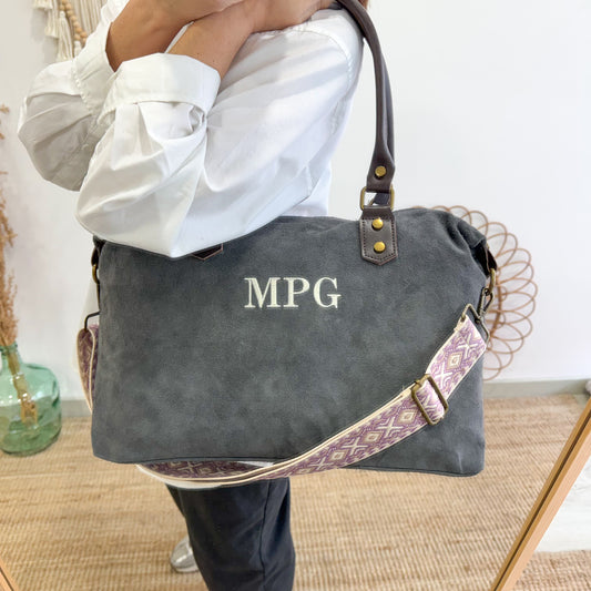 Bolso combinado loneta y piel gris iniciales bordadas con correa étnicaPrecio habitual €77,00Precio habitualPrecio unitario por-