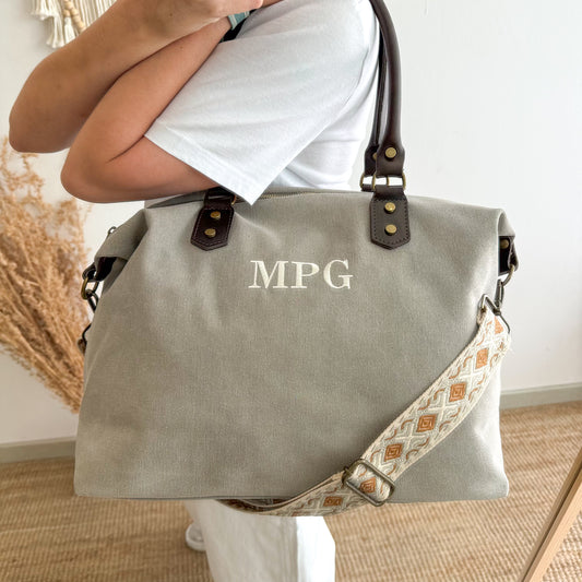 Bolso combinado loneta y piel gris claro iniciales bordadas con correa étnicaPrecio habitual €77,00Precio habitualPrecio unitario por€74,00Precio de oferta €77,00Agotado
