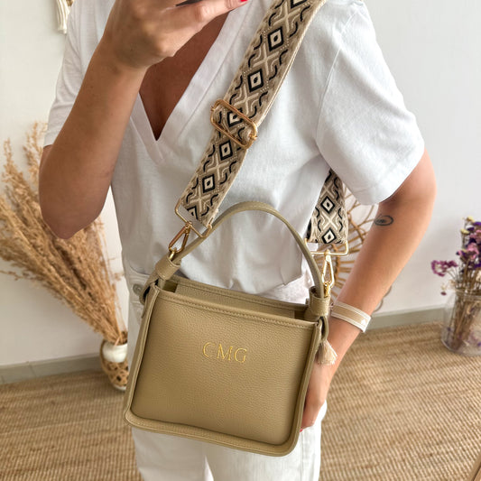 Bolso cuadrado serraje taupe herraje dorado iniciales bordadasPrecio habitual A partir de €53,00Precio habitualPrecio unitario por