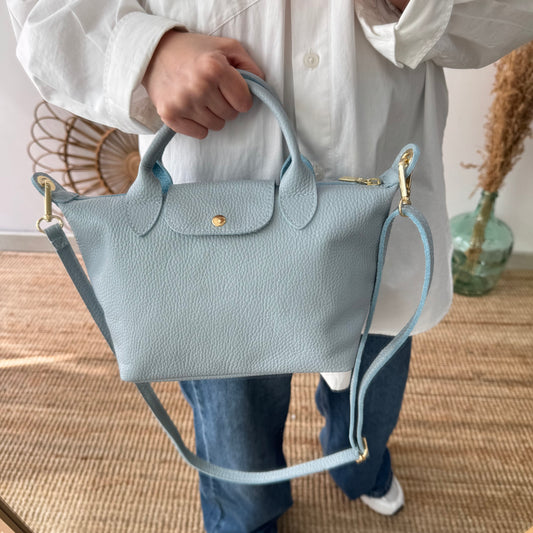 Bolso ovalado piel celeste solapa iniciales bordadas