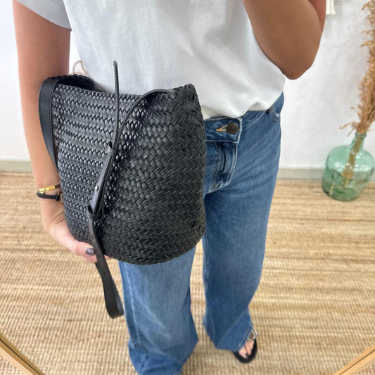 Bolso saco en piel trenzada negroPrecio habitual €125,00Precio habitualPrecio unitario por€125,00Precio de oferta €125,00