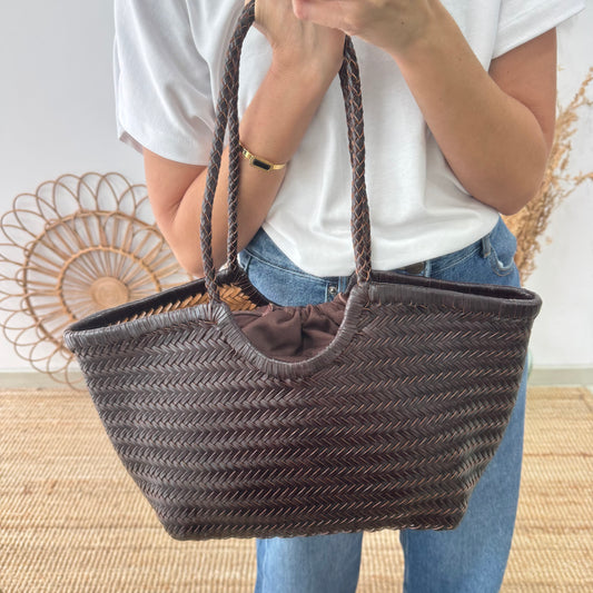 Capazo de piel trenzada marrón medianoPrecio habitual €139,00Precio habitualPrecio unitario por€139,00Precio de oferta €139,00