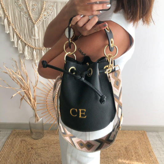 Bombonera piel negro arandelas doradas iniciales bordadasPrecio habitual A partir de €58,00Precio habitualPrecio unitario por-