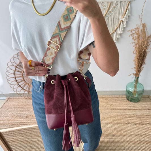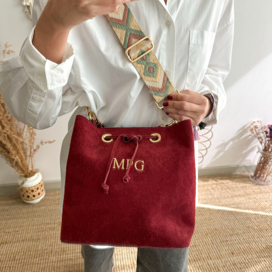 Bolso bucket serraje y piel granate pompón iniciales bordadas