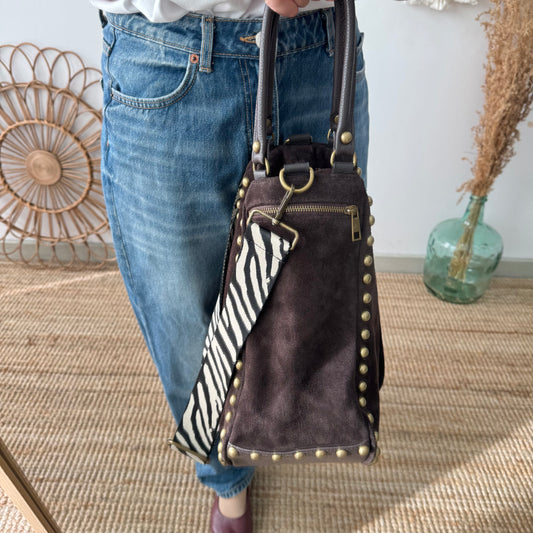 Bolso bucket serraje y piel marrón pompón iniciales bordadas