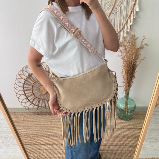 Bandolera serraje flecos beige herrajes dorados iniciales bordadas