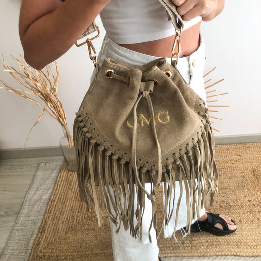 Bandolera serraje flecos camel herrajes dorados iniciales bordadas