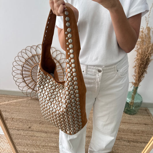 Black FridayBolso hobo camel con tachuelas plateadas