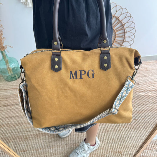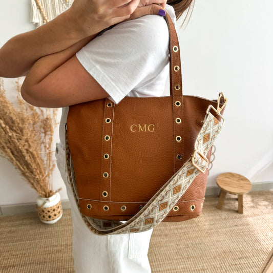 Bolso combinado loneta y piel camel iniciales bordadas con correa étnica