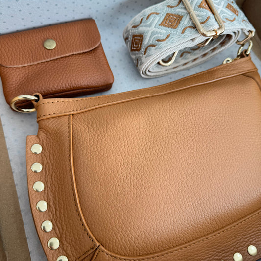 Pack regalo bandolera piel ovalada tachuelas camel iniciales bordadas