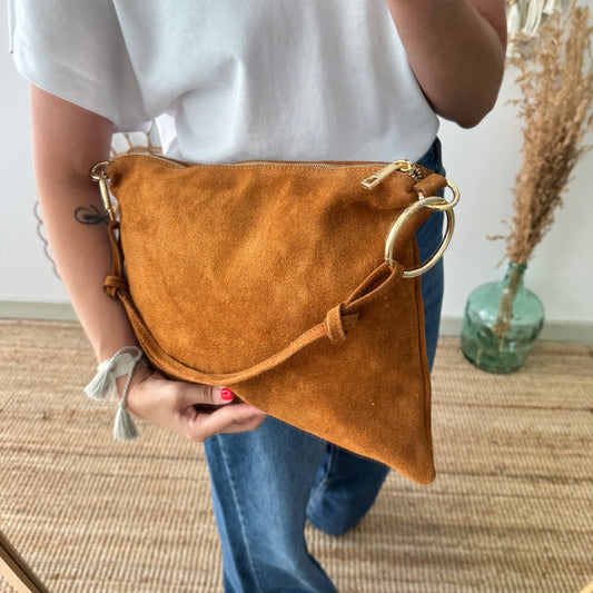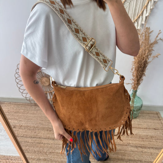 Bandolera serraje flecos camel herrajes dorados iniciales bordadas