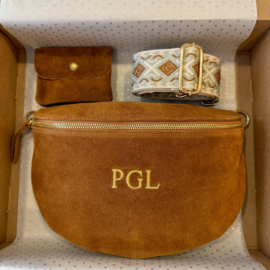 PACK REGALO RIÑONERA GRANDE ANTE CAMEL PERSONALIZADA