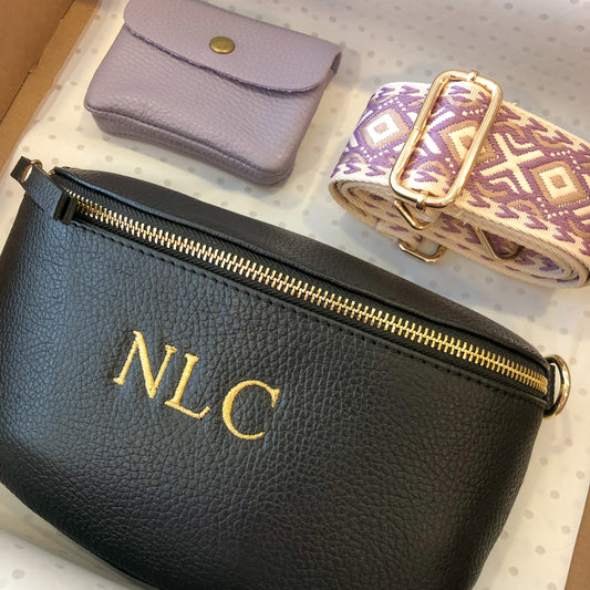 Riñonera/bandolera serraje taupe herrajes dorados iniciales bordadas