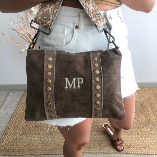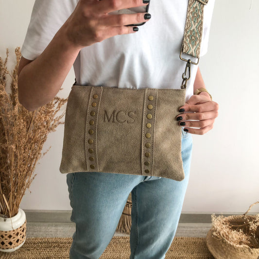 Bolso bandolera tachuelas serraje iniciales bordadas taupe