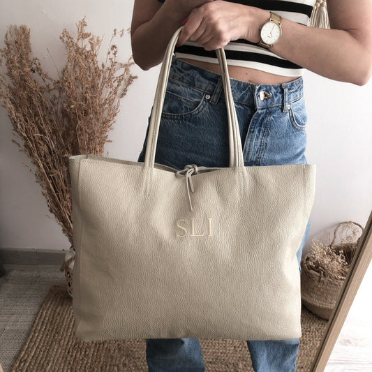 Shopper grande piel taupe cremallera personalizado iniciales bordadas