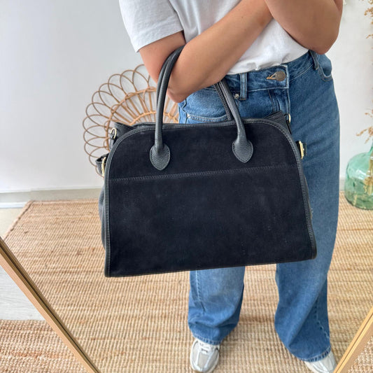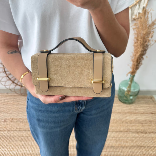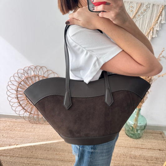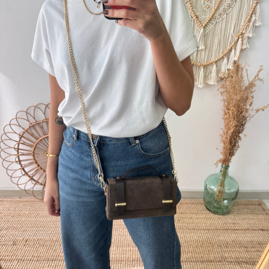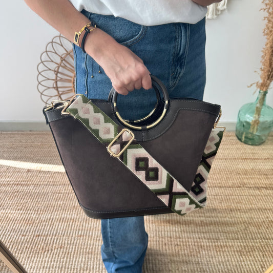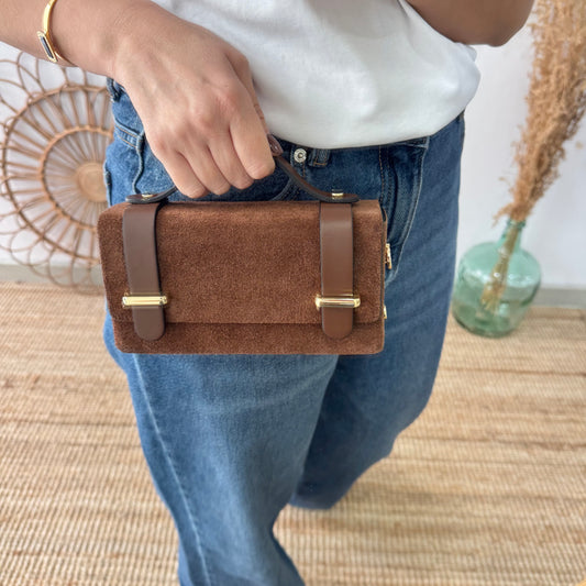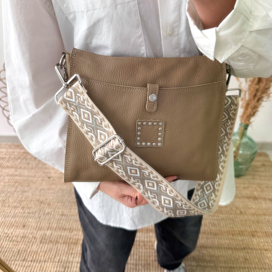 Bandolera ovalada piel tachuelas marrón iniciales bordadas