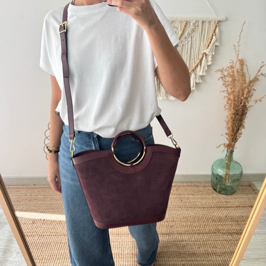 Bandolera ovalada piel tachuelas granate iniciales bordadas