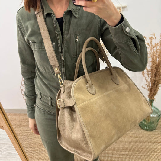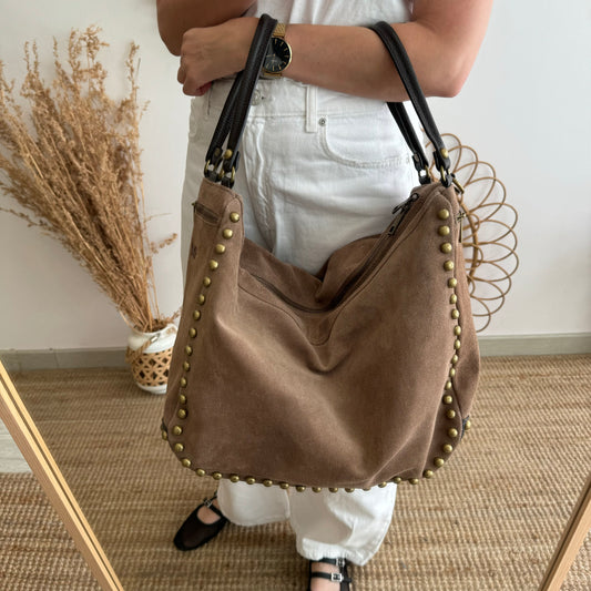 Bolso bucket serraje taupe arandelas herraje dorado iniciales bordadas