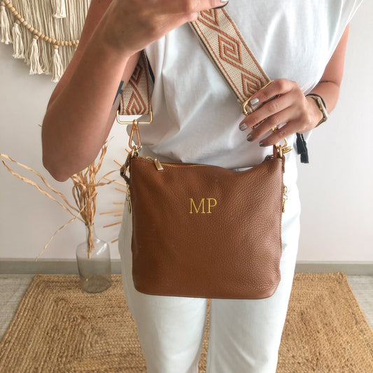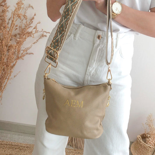 Bandolera loneta caqui iniciales bordadas con correa étnica