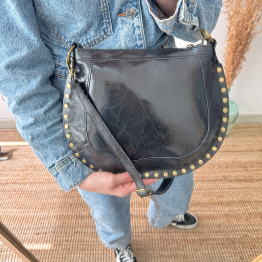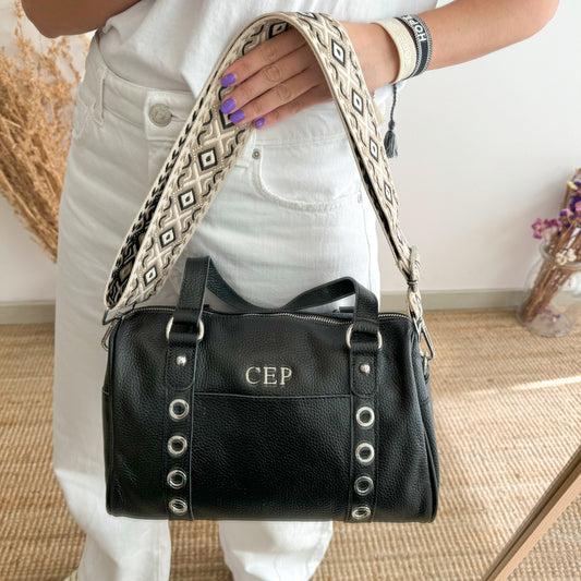 Bandolera ovalada piel tachuelas negra iniciales bordadas herrajes cobre