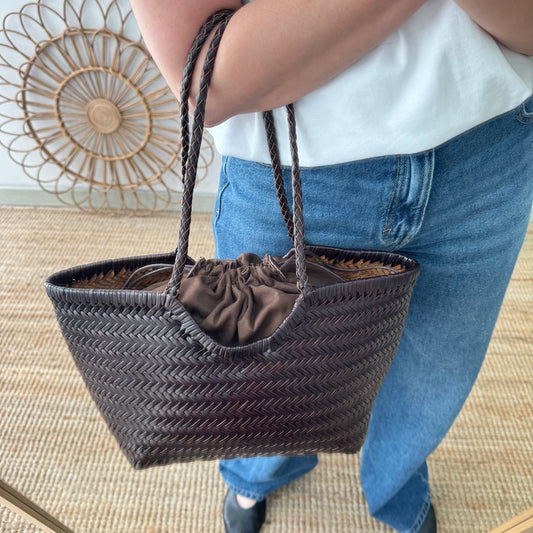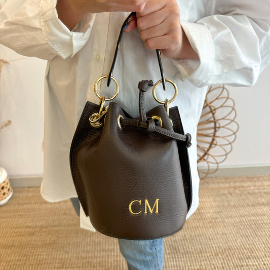 Bolso bucket serraje y piel marrón pompón iniciales bordadas