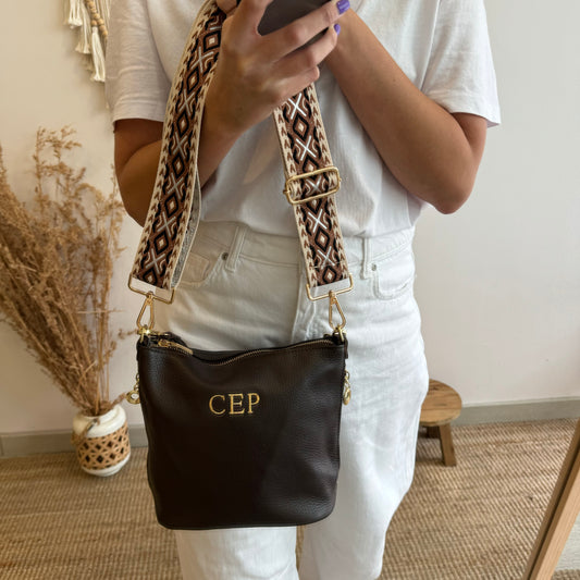 Bolso taupe oscuro loneta iniciales bordadas con correa étnica
