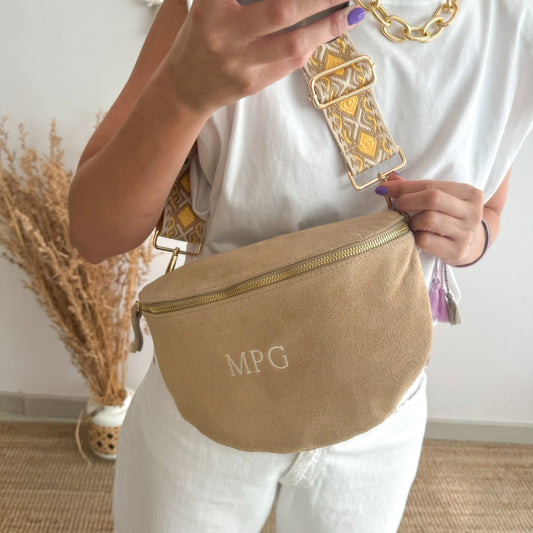 Riñonera/bandolera grande serraje beige iniciales bordadas
