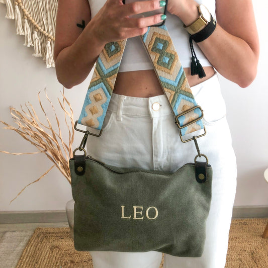 Bolso caqui loneta iniciales bordadas con correa étnica