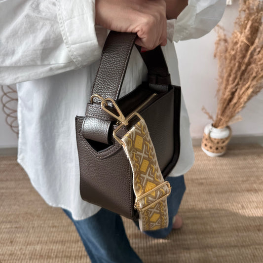 Bolso mostaza loneta iniciales bordadas con correa étnica