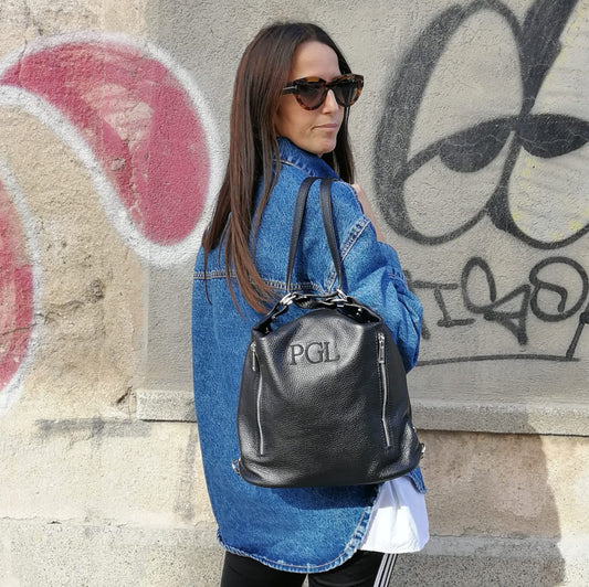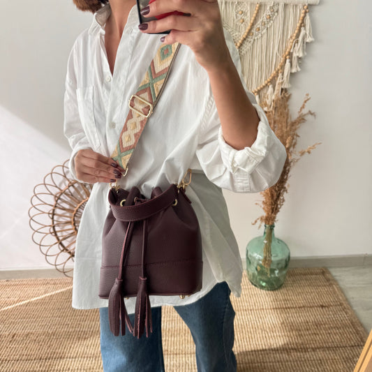 Bolso loneta y piel negro gastado iniciales bordadas con correa étnica