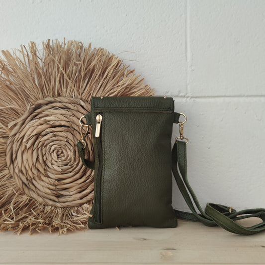 Porta móvil piel caqui tachuelas doradas