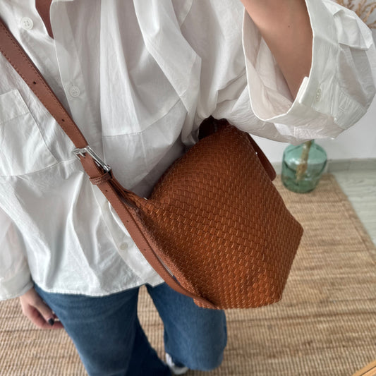 Bolso saco en piel trenzada cremallera camel