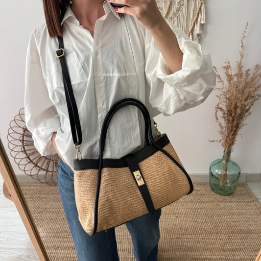 Bolso shopping piel y rafia negro mediano