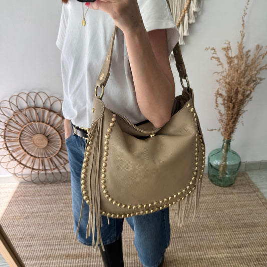 Bolso Hobo tachuelas y Flecos en Piel taupe