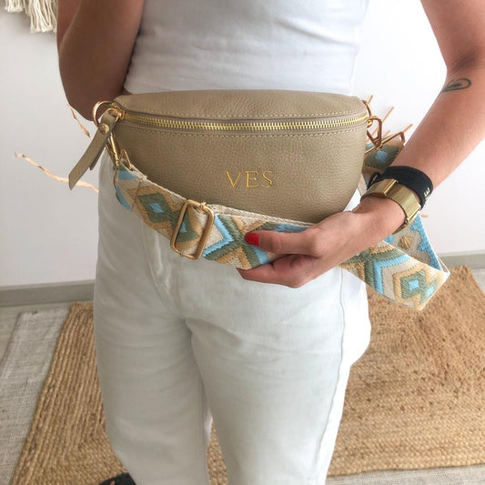 Riñonera/bandolera piel taupe iniciales bordadas correa étnica