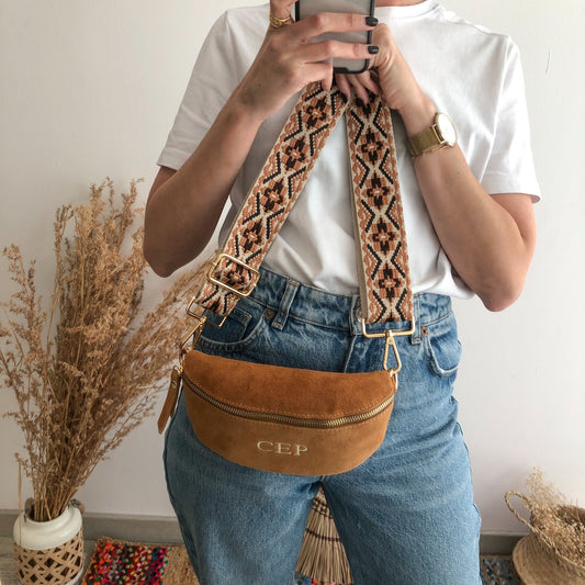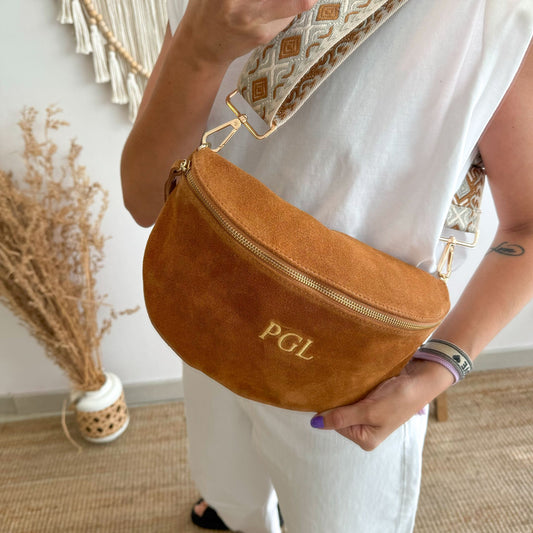 Riñonera/bandolera serraje camel iniciales bordadas correa étnica