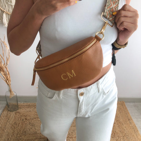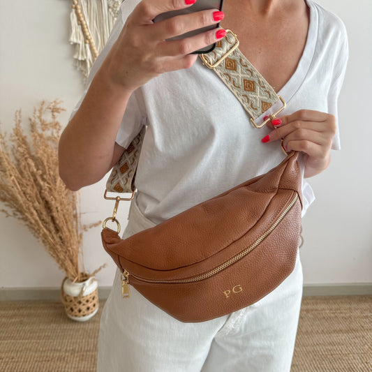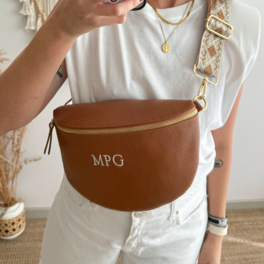 Riñonera/bandolera piel camel iniciales bordadas correa étnica