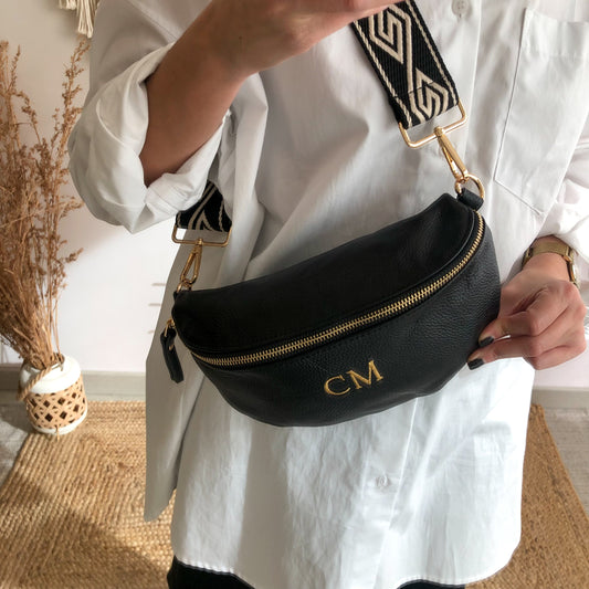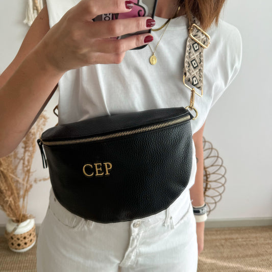 Riñonera/bandolera grande piel negro/oro iniciales bordadas