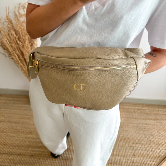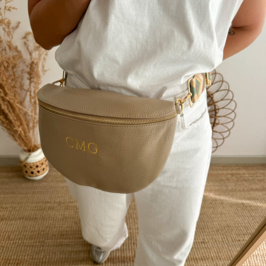 Riñonera/bandolera grande piel taupe/oro iniciales bordadas