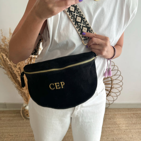 Riñonera/bandolera serraje negro iniciales bordadas correa étnica